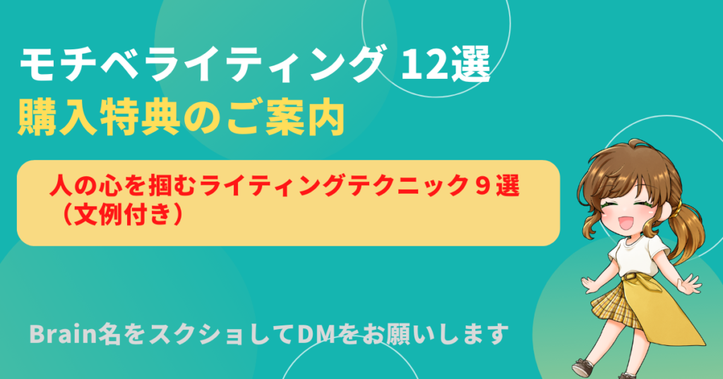 アメクマさんの「モチベライティング12選」なので、ライティング系の特典にしました!合わせて知っておいてもらいたい「人の心を掴むライティングテクニック9選」を特典としてお渡しします。