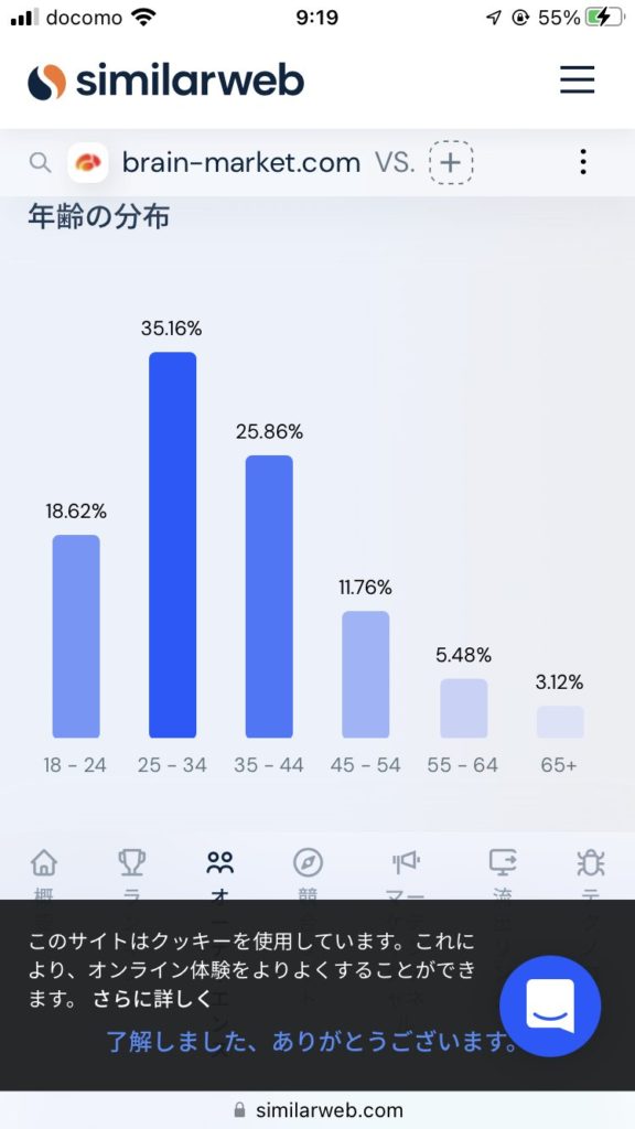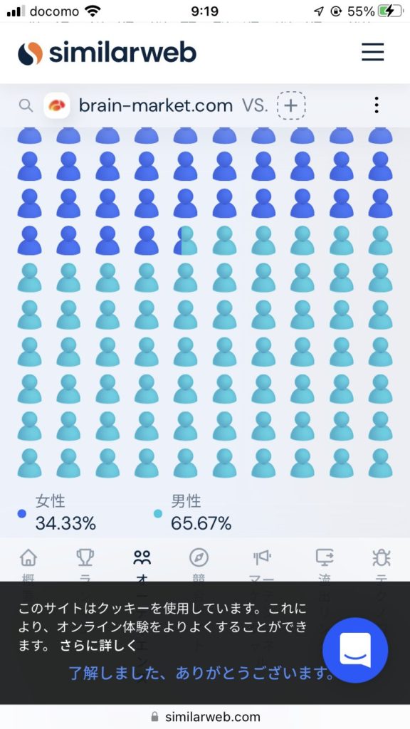 女性の販売者がかなり増えているように見えますが、Brainへのトラフィックはまだまだ男性が多いのは間違いないようです。