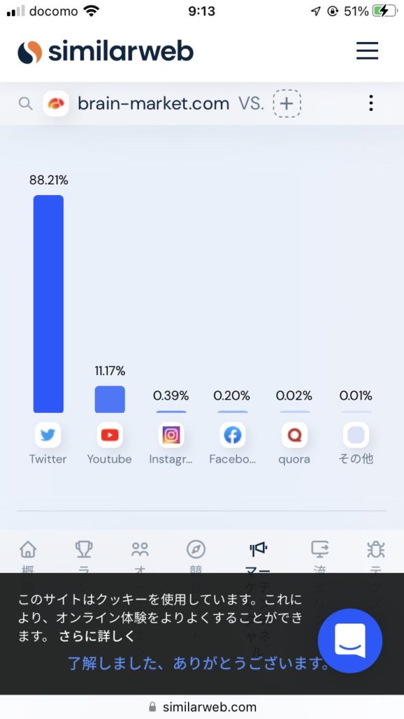 88.21と圧倒的にTwitterからのトラフィックが多いのが分かります。